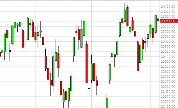 The MIB as you can see gapped lower at the open on Thursday, and then tried to rally. However, the 24,000 level above offered enough resistance to turn things back around and form a shooting star. With this, the shooting star suggests that we are going to go lower, but eventually we should find some type of support to start buying. On the other hand, if we can break above the 24,000 level, that is also a very bullish sign. Either way, we are buyers of the MIB on either type of move at this point in time.
