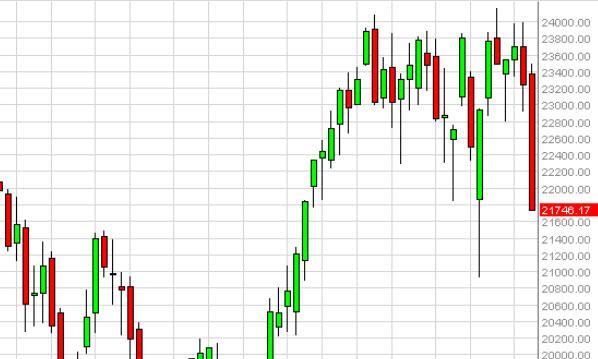 The MIB as you can see fell significantly during the course of the week, heading below the 22,000 level. With this, the market looks as if it is trying to find some support, but we don’t really see any chance of seeing quite a bit of support until we get to the 21,000 level. With this, we are waiting to see if we get a supportive candle, but would not be interested in trying to short this market for longer-term moves at this point in time as we do not think that the risk to reward ratio is good enough.