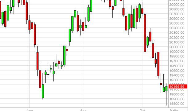 The MIB as you can see initially fell during the course of the day on Tuesday, breaking below the 19,000 level. However, we found enough support below to turn things back around and form a hammer. Because of this, and the fact that we have the hammer preceded by a shooting star suggests that we are going to continue to go sideways in the neighborhood of 19,000 or so. Because of that, we don’t really necessarily have an interest in trading this market until we get above 19,500 to the upside, or a break below the 18,800 level to the downside.