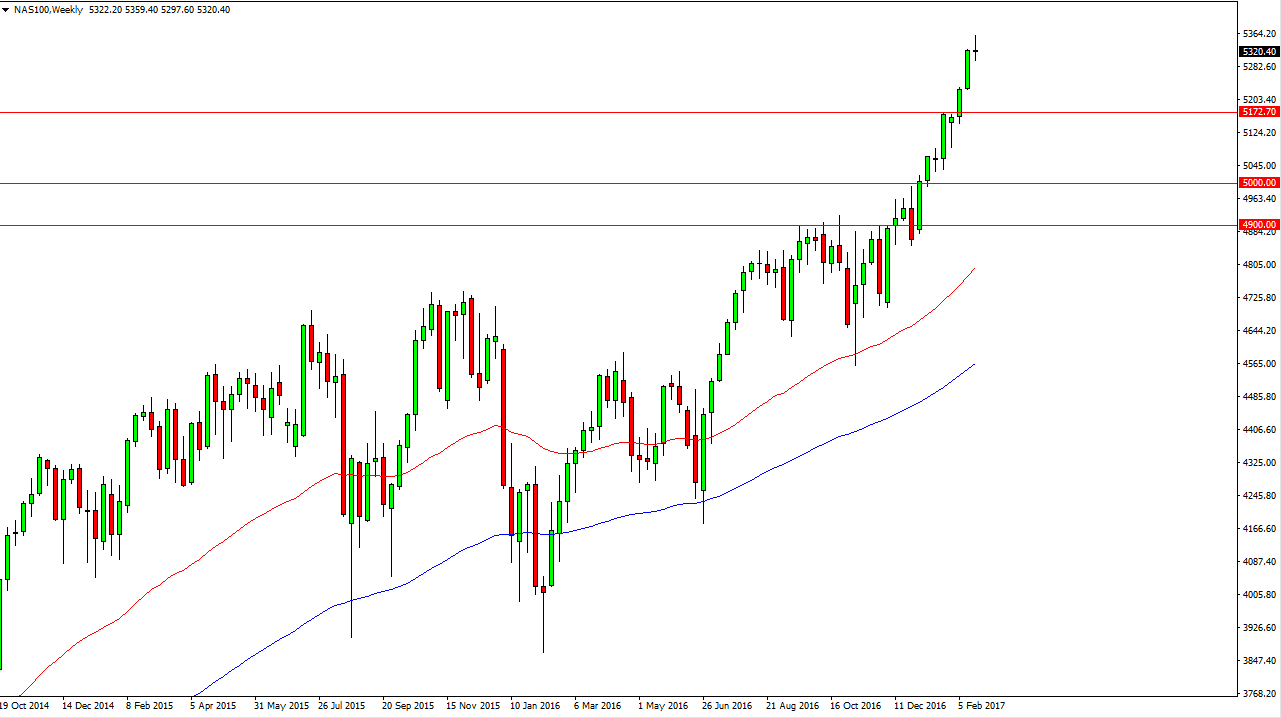 The NASDAQ 100 tried to rally during the week but as you can see we turned around to form a shooting star. This is an extraordinarily overbought market so I think a pullback is coming. I would love to see this market pull back to somewhere near the 5175 handle to take advantage of value, but I certainly have no interest in selling as we are so strong.