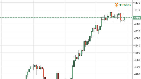 The NASDAQ 100 has turned right back around to form a positive candle during the day on Monday, and as a result it looks like we are going to reach towards the 4840 handle above. This is a market that continues to grind sideways overall, as it shows that the market still has quite a bit of bullish pressure as we have not pulled back from the massive move higher. At this point in time, the market should then reach towards the 5000 level given enough time, but we have to wait until more of the volume returns from summer break.
