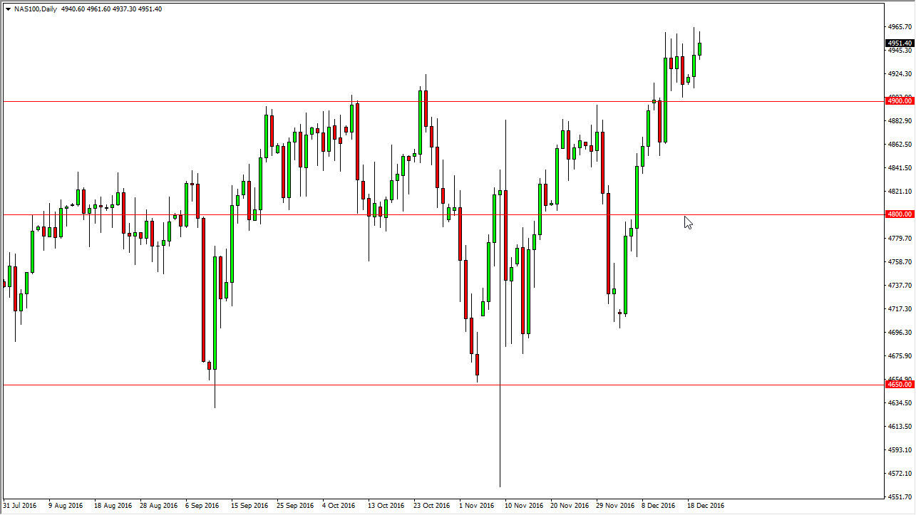 The NASDAQ 100 rallied on Tuesday, testing the resistance yet again. Because of this, I think that eventually we will break out but we may have to break above the 5000 level in order to see any real momentum pick up. I also believe that the market might be a bit hesitant to do it had of the holidays, so we could get several pullbacks in the short-term. Those pullbacks should be value though, so having said that given enough time I believe that every time we drop you can start scalping the market to the upside again.