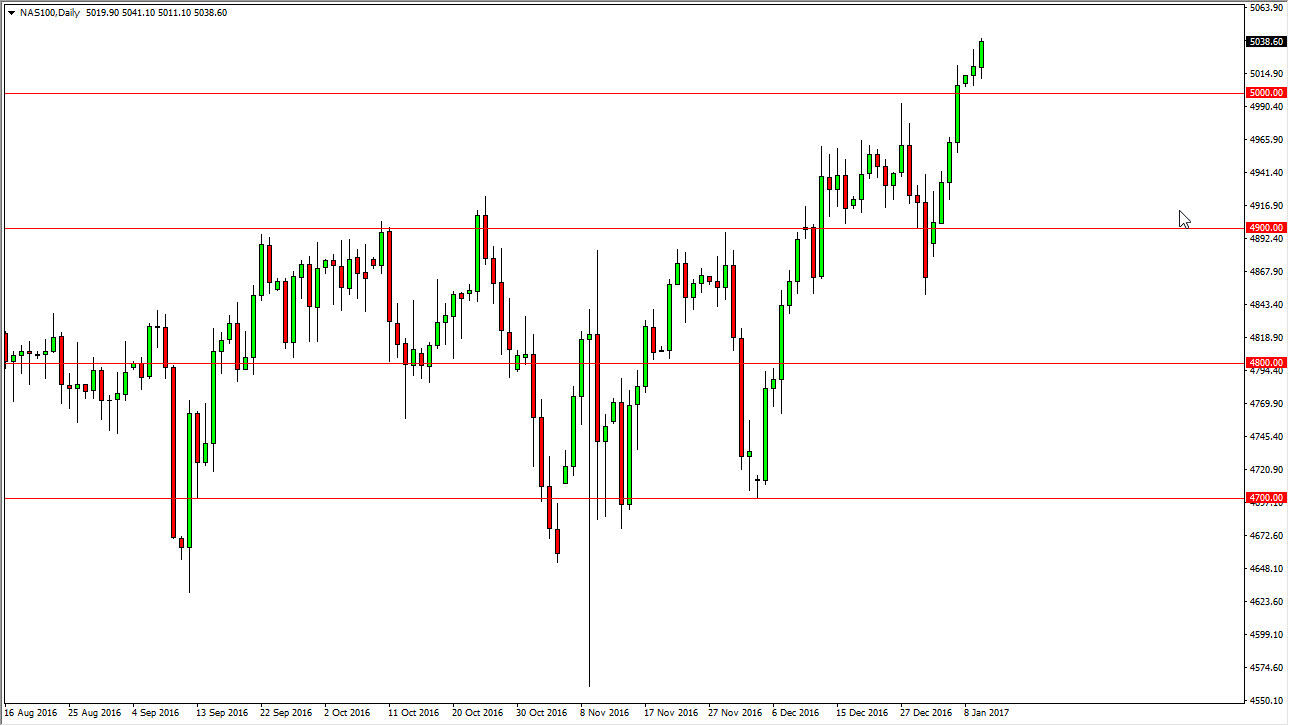 The NASDAQ 100 continues to show strength, as the Tuesday session led to yet another high. In fact, we broke above the top of the shooting star for money, so it suggests to me that buyers are going to continue to push much higher. I believe that the 5000 level is now the “floor” in the market, and that pullbacks should continue to be supported. After all, most traders would recognize this as a break out, and those who have missed the move will be looking to get involved as soon as they can.