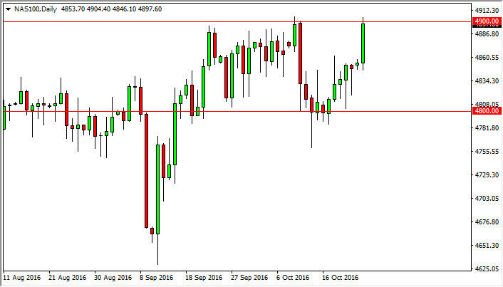 The NASDAQ 100 had a very strong session during the day on Monday, slamming into the 4900 level. As soon as we can break above the top of the range for