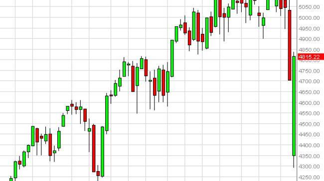 The NASDAQ as you can see gapped lower at the beginning of the week, crashing through to the 4300 level. With that being the case, the market bounced from a reasonable support level, and shot all the way up to the 4800 level. The fact that the gap not only got filled but broken above tells us that the market should continue to go much higher given enough time. We will look for pullbacks in order to take advantage of value in a market that is obviously very bullish.