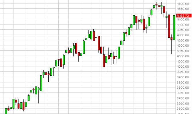The NASDAQ as you can see broke much higher during the course of the week, clearing the 4300 level. That was the level of that was of the top of the