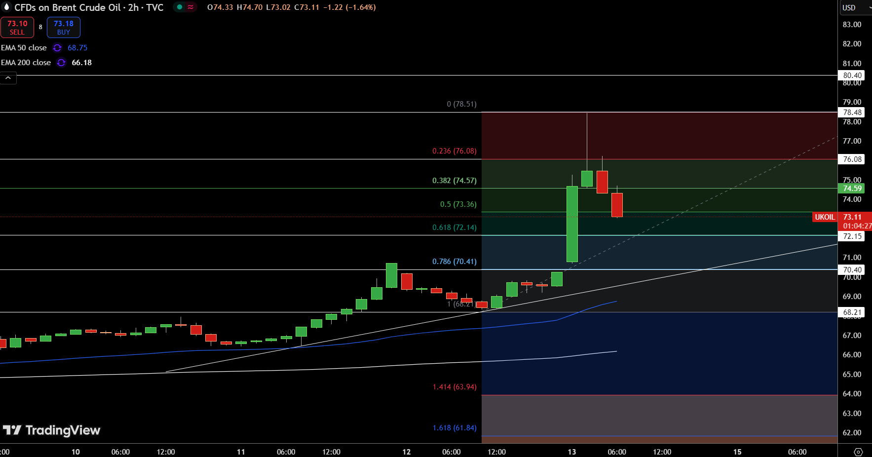 Brent crude has pulled back to $73.13 after reaching a high of $74.70, with price now testing the 50% Fibonacci retracement at $73.36. The decline follows a sharp rally from $66.21, with bullish momentum starting to ease as candles shrink and selling pressure builds near the 38.2% Fib level at $74.57.