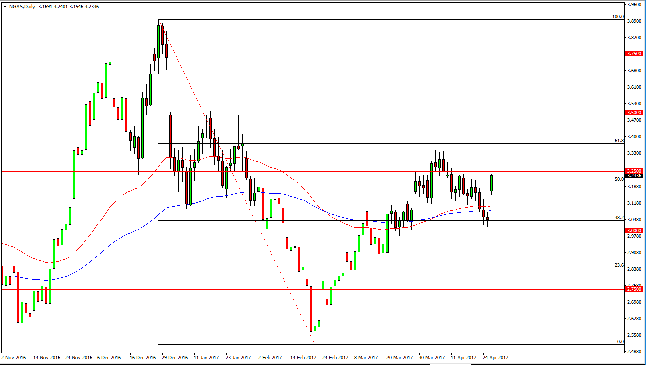 Natural gas markets gapped higher at the open on Wednesday, slamming into the $3.25 level. This is obviously very bullish sign, but at this point it’s