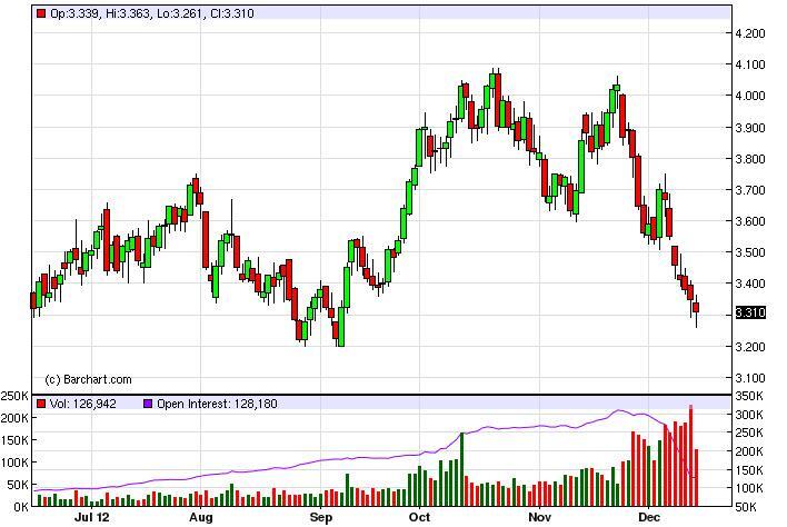 Looking at this chart, we still feel that this market will continue to be bearish overall, but we would prefer to see some type of rally in which to start selling. Perhaps a move back up to the $3.50 level would be a bit handy, however, we are not willing to close out of are already short positions. We think it’s obvious at this point that the $3.00 level will be retested before it’s all said and done in this marketplace, and the warm weather in the United States certainly isn’t helping any type of bullish sentiment in this market.