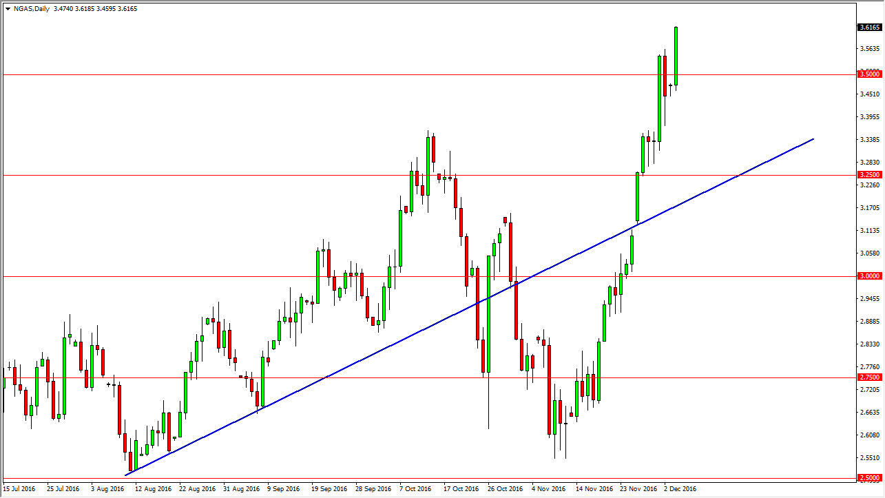 The natural gas markets broke out again during the day on Monday, as we have now clear to the $3.60 level. This is an extraordinary move, but quite