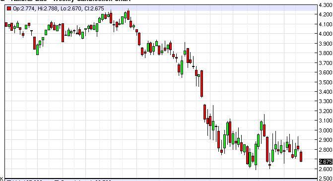 The natural gas markets gapped lower at the open on Monday, and then continued to fall significantly during the course of the week. We believe that the market is going to try to test the lows again, which is somewhere near the $2.60 level, so short-term we should see this market fall. However, we do not know whether or not this market is going to be able to break down quite yet, so a bounce is very likely. This is not really a long-term market to be involved in oh, we believe that short-term traders will continue to push this thing around.