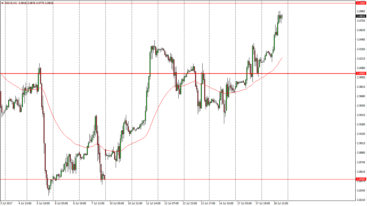 The natural gas markets the shot much higher during the day on Tuesday, reaching towards the $3.10 level above. This is an area that has a lot of