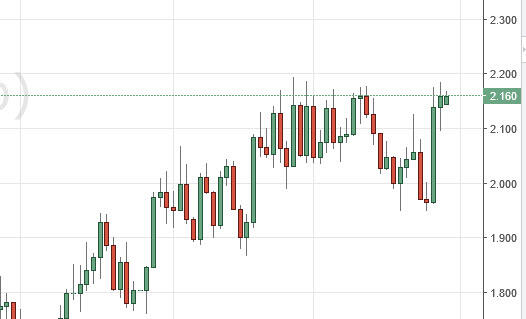 Natural gas markets did very little during the session on Monday as we would’ve had most traders away for Memorial Day festivities, and as such liquidity would’ve been difficult to say the least. The $2.20 level above continues to be a major barrier, and as a result we are going to wait to see what we get as far as a daily candle at that level in order to either buy natural gas above the $2.20 level, or perhaps selling based upon an exhaustive candle in that area. Nonetheless, Mondays candle doesn’t really tell us much.