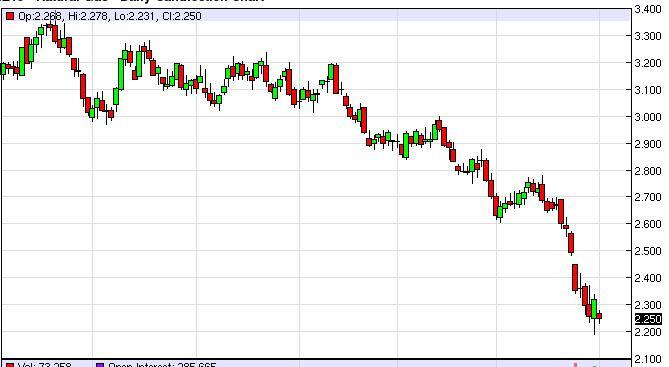 The natural gas markets fell slightly during the course of the session on Monday, as we continue to see weakness in this market. However, we think that a bounce could be coming and that of course would be a selling opportunity. We think that the downtrend continues, and have no interest whatsoever in buying natural gas as it is so weak at the moment. Ultimately, we believe that there is more than enough resistance above at the 2.50 level to keep this market very soft over the longer term, as supply far outweighs demand.
