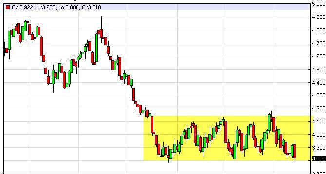 The natural gas markets as you can see fell during the course of the day on Tuesday, testing the $3.80 level. That area is pretty significant as far as support is concerned though, so that being the case we feel that there should be plenty of buying pressure in this area, but if we break down below $3.80 and close on the daily chart, that would be a very negative sign and we feel at that point in time it would be the beginning of another leg at lower and the natural gas markets. On the other hand, we break the top of the candle from the session on Tuesday, the market will more than likely head to the $4.10 level.