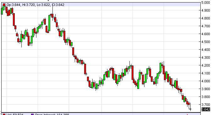 Even if we rally, we think that the sellers will continue to be in control of this market until we break well above the $4.00 level. There is probably significant resistance all the way to the $4.25 level as well, so with that it’s likely to continue to be a bearish market for the foreseeable future. The $3.50 level should be pretty significant as far as support is concerned, as it is a large, round, psychologically significant number. It is possible that we get down below that level as well, but in the meantime that is our target as the market continues to fall.