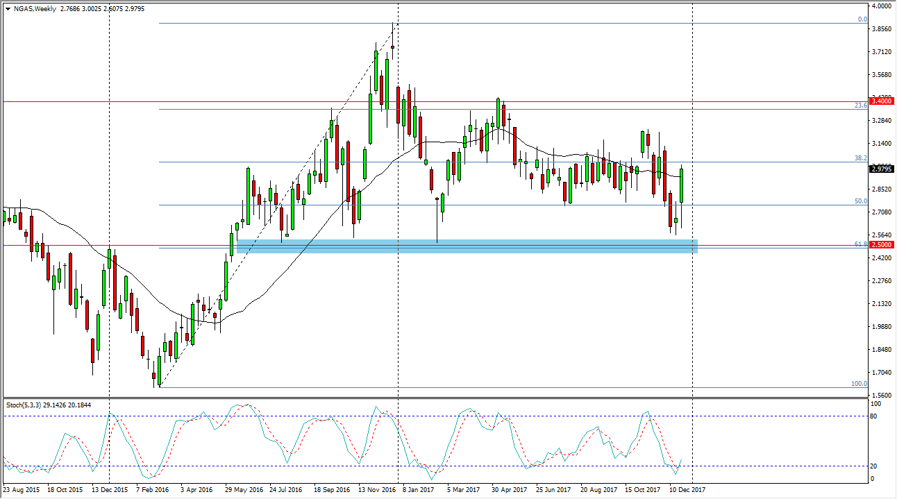 Natural gas markets initially were bullish during the week, but then rolled over to fill that gap and beyond. After that, we got an inventory number that was in line with expectations, and then shot through the roof. However, longer-term traders know better.