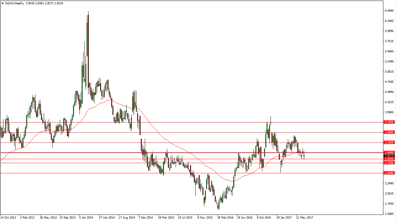 The natural gas markets had a very volatile week, as we bounced between the $2.85 level on the bottom and reached above the $3.00 level on the top. Ultimately, the market ended up forming a bit of a neutral candle. This being the case, it seems very likely that the market should continue to break down though, because the $3.00 level is massively resistive. I believe that the overall attitude of the market will be negative, and with this being the case it’s likely that the market will continue to pay attention to the oversupply of natural gas, and therefore I believe that rallies will continue to be selling opportunities. Ultimately, the market could go much lower, but I would also anticipate a significant amount of volatility as the markets aren’t necessarily known for stability.