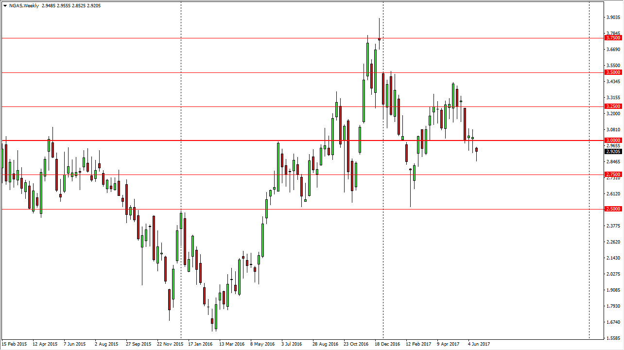 Natural gas market gapped lower at the open on Monday, and then broke down significantly. However, as we went deeper into the week, we turned around to form a hammer. This hammer suggests that there is going to be some buying, but the $3.00 level above should be resistance. I don’t have any interest in buying though, because of all of the resistance and the lack of a risk to reward ratio. I’m looking to see some type of exhaustive candle near the $3.00 level that I can turn around and search shorting. Alternately, if we break down below the bottom of the hammer, then the market goes down to the $2.75 level. Given enough time, the market should break down below there even, perhaps reaching down to the $2.50 level.