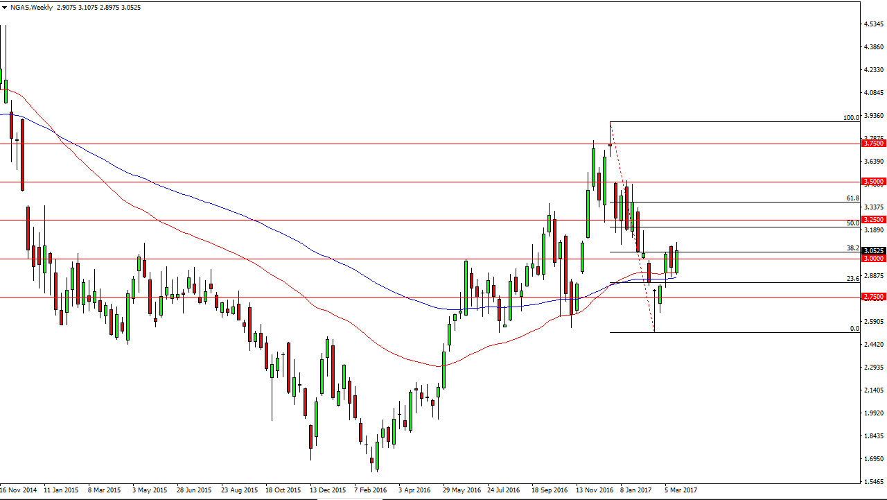 Natural gas markets rose during the week, bouncing off a couple of major moving averages and essentially showing that we are going to consolidate around the $3 level. Because of this, I believe that it could be difficult to trade this market from the longer-term, but I think that sooner rather than later the sellers will return. I remain bearish of natural gas in general, but this is obviously an area where there is a lot of order flow, so it makes sense that we will bounce around quite a bit.