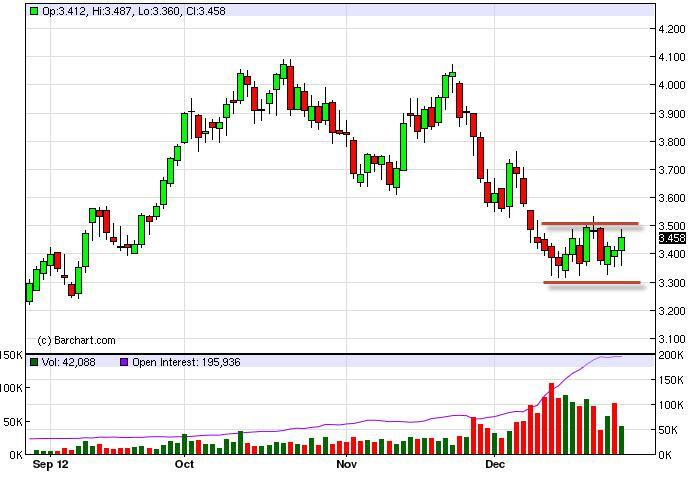 We think that the $4.00 level will act as a bit of a ceiling in this market going forward, and at that point time should attract quite a bit of selling. If we can manage to get that I, we would jump all over a resistant candle as you can see what has happened over the last month or so. However, our base case scenario is that we are going to break down from this general vicinity once the large volume of traders comes back into the marketplace. In January we should see a pickup in volume, and as a result the sellers could come back out in full force. On a daily close below 3.30 we are more than willing to start selling again. Alternately, if we see a rally that shows some type of resistant candle between here and $4.00 that will more than likely be a signal to start selling as well.