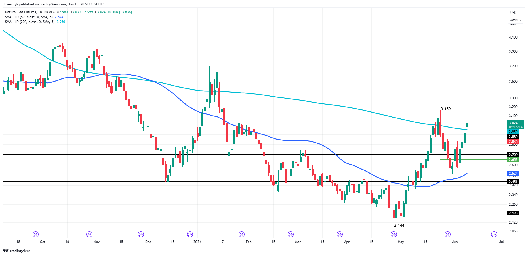 U.S. natural gas futures are soaring on Monday after moving above the 200-day moving average, indicating a bullish trend. The current movement positions natural gas to challenge the May 23 high of $3.159, potentially paving the way for a further rise to the $3.682 to $3.697 range. The driving force behind this surge is the expectation of increased demand due to forecasts of hot temperatures through the end of June.