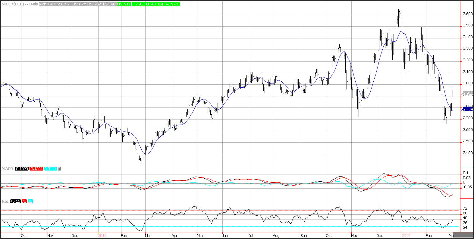 Natural gas prices might have formed a bottom as hedge fund traders dumped long positions in futures and options according to the latest commitment of trader’s report released for the date ending February 28, 2017. The decline in long position was one of the largest of the past 12-months. Prices gapped higher closing up 2.76%, but well of the highs of the session. Support is seen near the 10-day moving average at 2.77, while resistance is seen near the February 15 highs at 3.09.