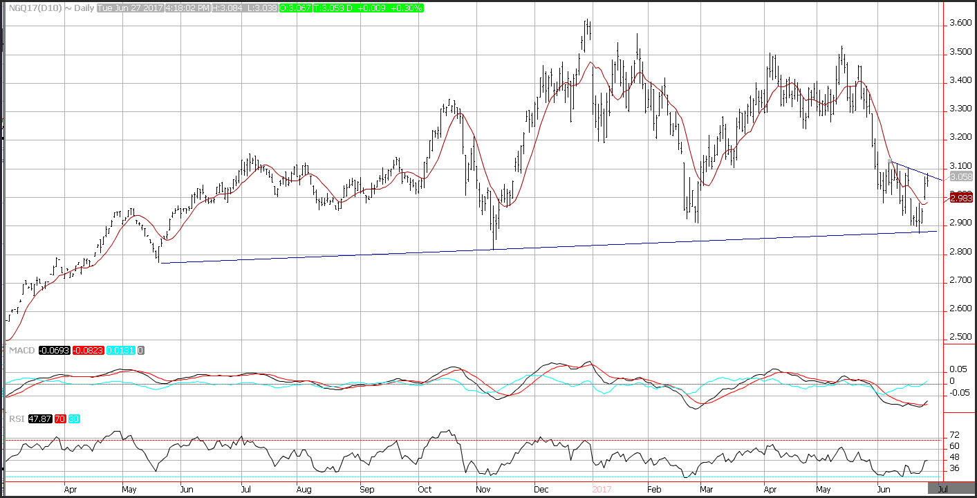 Natural gas prices moved higher on Tuesday but were unable to recapture resistance. Warmer than normal weather is forecast to cover most of the United States according to the latest forecast by the National Oceanic Atmospheric Administration. Warm weather increases cooling demand which helps buoy natural gas prices.