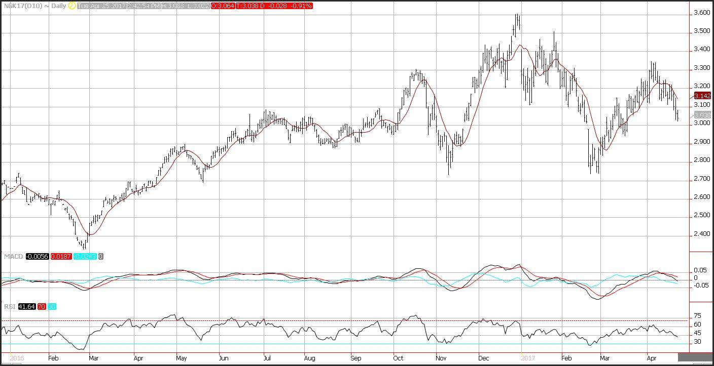 Natural gas prices continue to trade on the defensive as it appears that hedge funds remain long, which means that lower prices are the path of least resistance. According to the latest commitment of trader’s report for the date ending April 18, managed money had accumulated a net long position equivalent to 3,511 billion cubic feet, the highest for three years, according to the CFTC. Traders await Thursday’s inventory report which is scheduled to be released at 10:30 ET by the Energy Information Administration.