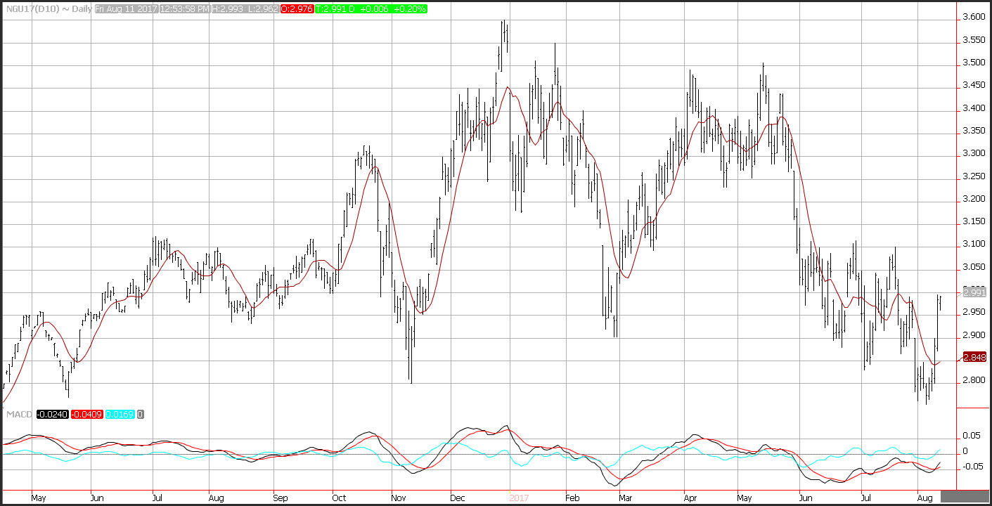 Natural gas prices initially moved lower on Friday, but rebounded during the PM trading session, and were nearly unchanged on the day. Thursday’s smaller than expected increase in natural gas inventories buoyed the markets allowing natural gas to surge to hit the highs for August. Warmer than normal weather is now forecast to cover most of the United States for the next 8-14 days, which should increase cooling demand.