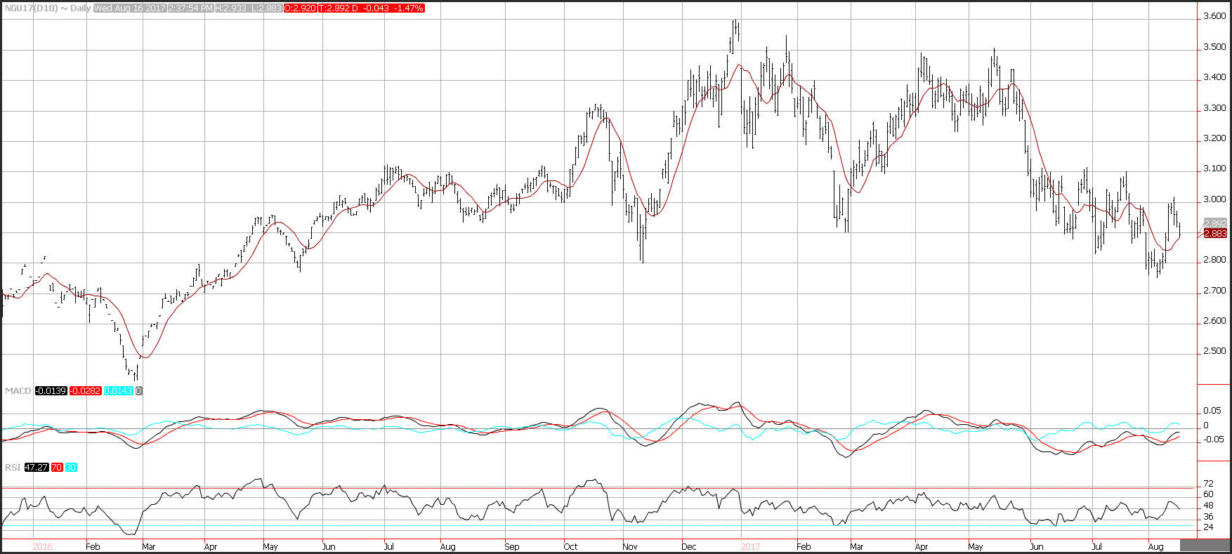 Prices moved lower finding support near the 10-day moving average at 2.88. Resistance is seen near the August highs at 3.02. Momentum is neutral as the MACD (moving average convergence divergence) histogram prints in the black but the trajectory has turned negative which is pointing to the potential for a crossover sell signal. The RSI (relative strength index) moved lower with price action reflecting accelerating negative momentum. The current reading of 47, is in the middle of the neutral range and reflect consolidation.