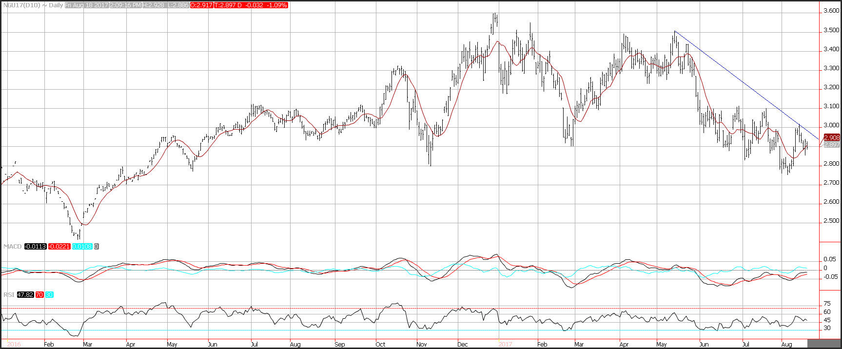 Natural gas prices were lower on Friday, despite a report from Baker Hughes that showed that natural gas rigs dropped by 3. Prices generated an inside
