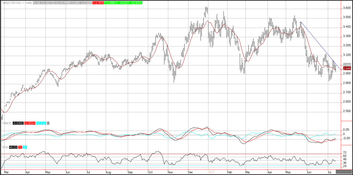 Short term support is seen near the 10-day moving average at 2.98. Additional support is seen near the July low at 2.83. A break of the resistance trend line at 3.01 would lead to a test of the June highs at 3.11. Momentum remains positive as the MACD (moving average convergence divergence) histogram prints in the black with an upward sloping trajectory which points to higher prices.