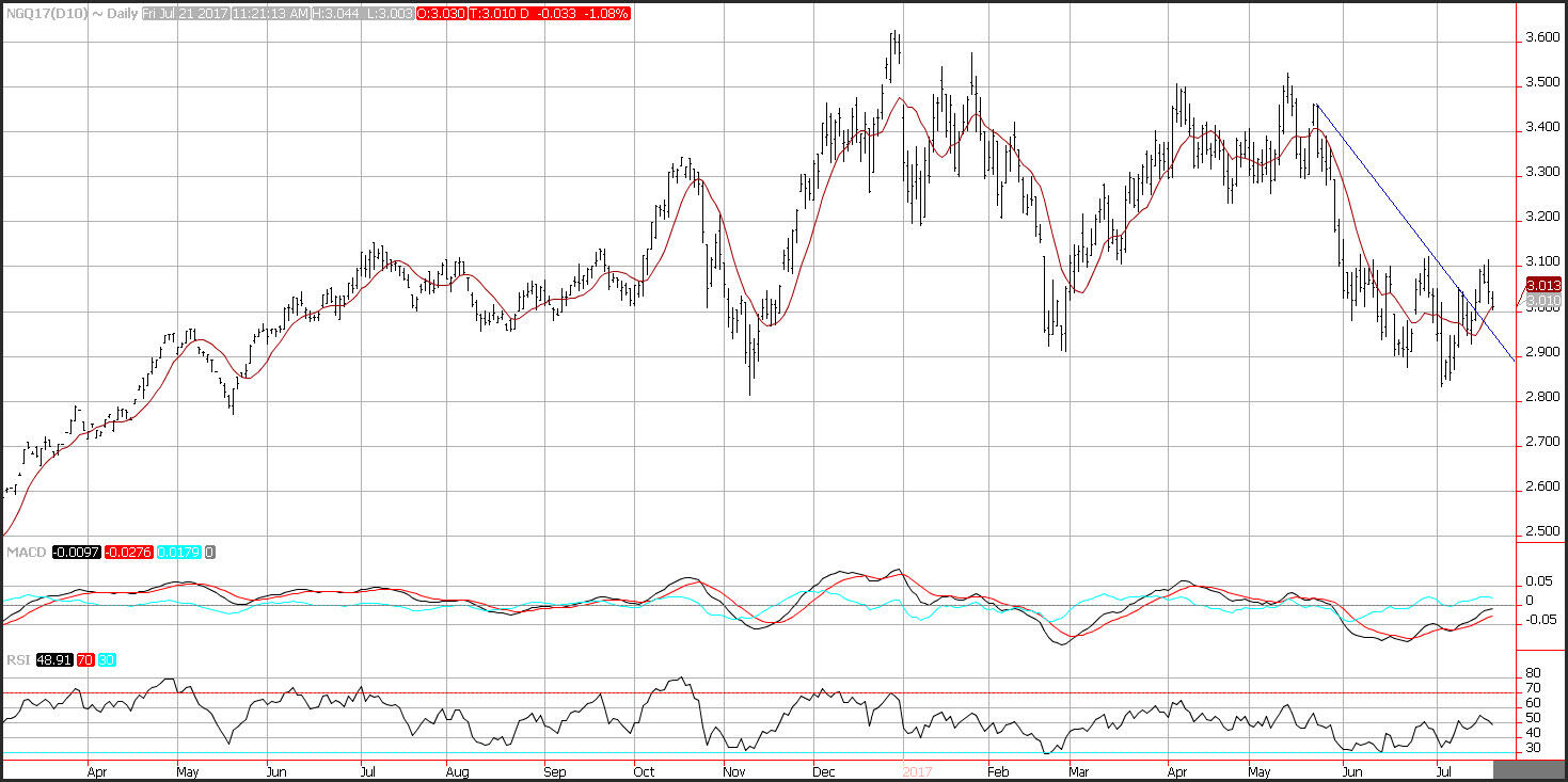 Natural gas prices moved lower on Friday despite a larger than expected draw in inventories reported on Thursday by the Department of Energy. Prices dipped toward support near the 10-day moving average at 3.01. Resistance is seen near the July highs at 3.11. Positive momentum is decelerating as the MACD (moving average convergence divergence) histogram prints in the black with a declining trajectory which points to consolidation.
