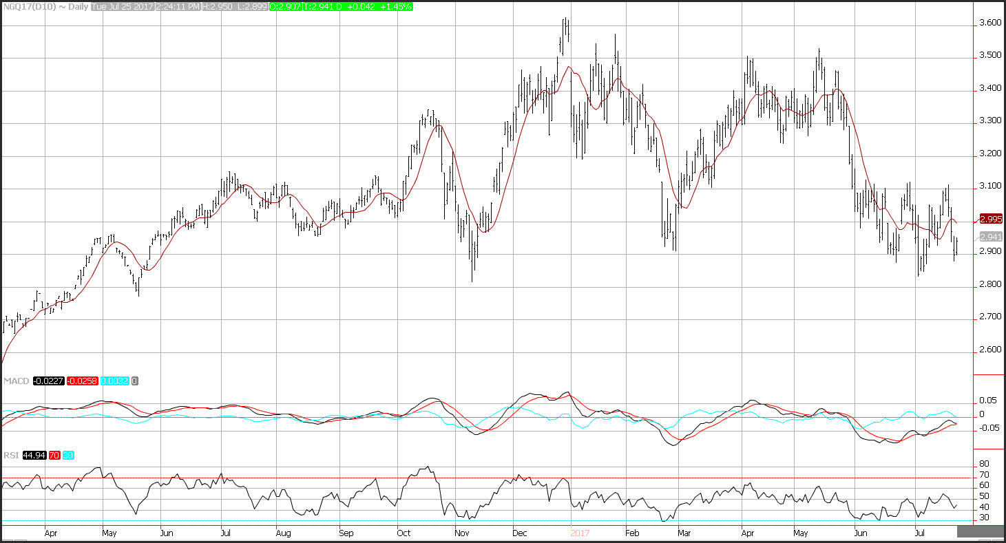 Natural gas prices moved higher on Tuesday generating an inside day which reflects indecision. The rebound follows Monday drop of more than 2%, after a report was released by the National Oceanic Atmospheric Administration. The report shows that the weather over the next 2-weeks is expected to be cooler than normal which could reduce cooling demand and weigh on natural gas prices.