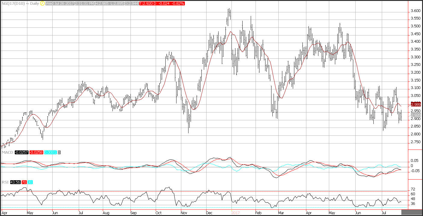 Prices made a higher high and a higher low, but the lower close reflects a confused market. Support is seen near the weekly lows at 2.88. Choppy conditions make this a difficult market to trade. Resistance is seen near the 10-day moving average at 2.99. Additional resistance is seen near the July highs at 3.11. Momentum is neutral as the MACD (moving average convergence diverge) histogram prints near the zero-index level with a flat trajectory which points to further consolidation.