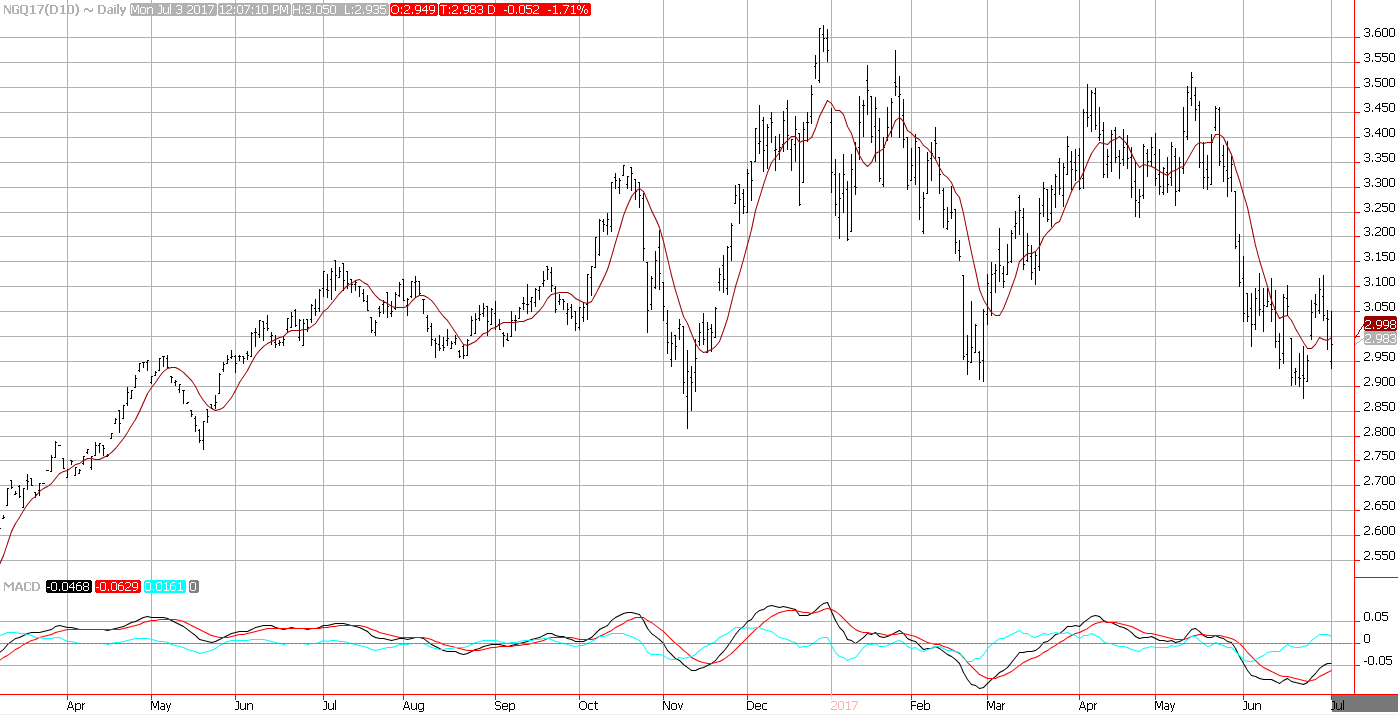 Natural gas prices whipsawed and then moved lower ahead of the Independence Day holiday as cooler than normal weather is expected to cover most of the United States over the next 8-14 days according to the National Oceanic Atmospheric Administration. Cooler weather during the heart of the summer in the U.S. reduces nature gas demand. The move comes despite the smaller than expected increase in inventories reported last Thursday by the U.S. Department of Energy.