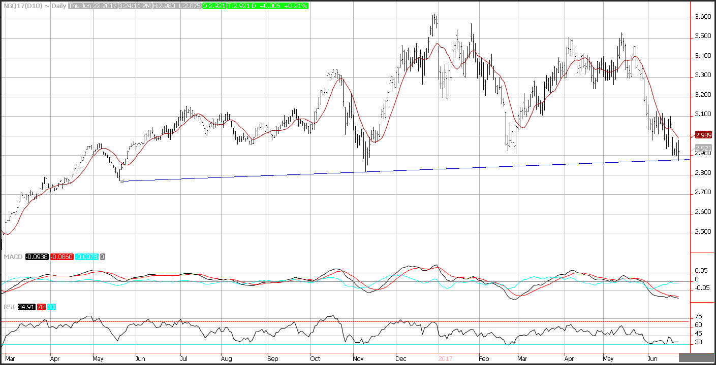 Natural gas prices whipsawed closing slightly higher after testing both support and resistance levels following a slightly larger than expected inventory report released Thursday by the Department of Energy. Prices initially moved higher early, testing resistance near the 10-day moving average at 2.98. Following the larger than expected build in stocks, prices tested trend line support which is seen near an upward sloping trend line that comes in near 2.88. Momentum remains negative as the MACD (moving average convergence divergence) histogram prints in the red with a downward sloping trajectory which points to lower prices.