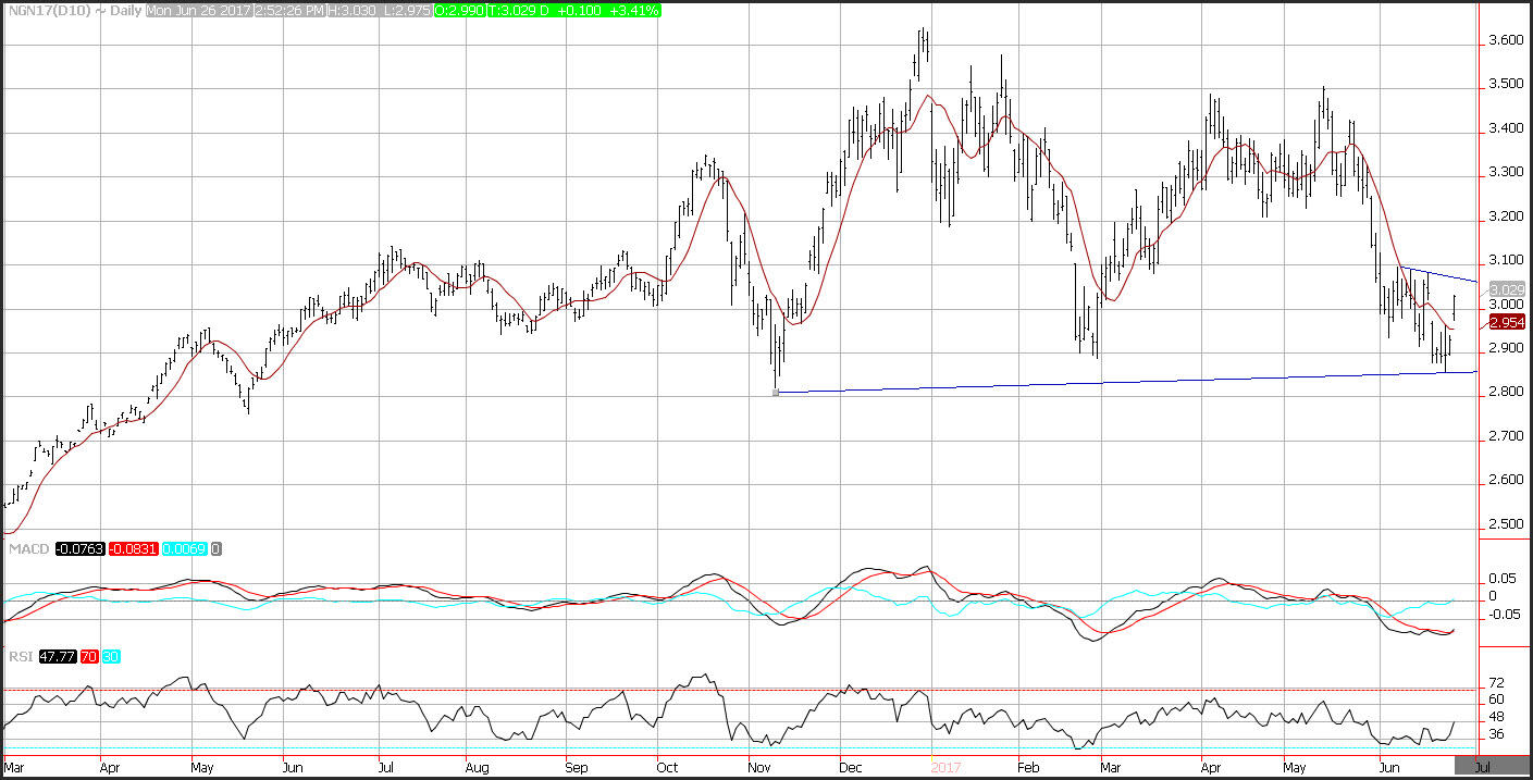 Natural gas prices moved higher on Monday following a forecast from the National Oceanic Atmospheric Administration which shows that warmer than normal weather is expected to cover most of the United States for the next 8-14 days, driving up natural gas demand. Prices rebounded sharply climbing more than 3.4%. The next level of target resistance on natural gas prices is seen near a downward sloping trend line that comes in near 3.07. Additional resistance is seen near the June highs at 3.10. Support on natural gas is seen near an upward sloping trend line that comes in near 2.86.