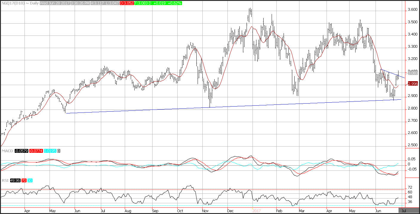 Natural gas prices pushed higher closing above trend line resistance, as warmer than normal weather is forecast to cover most of the United States over the next 8-14 days according to the Nation Oceanic Atmospheric Administration. Prices pushed to test June highs at 3.12, but were unable to hold these elevated levels ahead of Thursday inventory report from the Department of Energy. Support is seen near the 10-day moving average at 2.99.