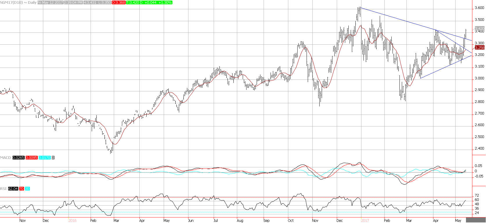 Prices tests former resistance now support from a downward sloping trend line that is constructed from the highs in December to the highs in April that comes in near 3.35. Prices also surpassed the April highs and are now poised to test the January highs at 3.54. Momentum has turned positive as the MACD (moving average convergence divergence) index generated a crossover buy signal. This occurs as the spread (the 12-day moving average minus the 26-day moving average) crosses above the 9-day moving average of the spread.