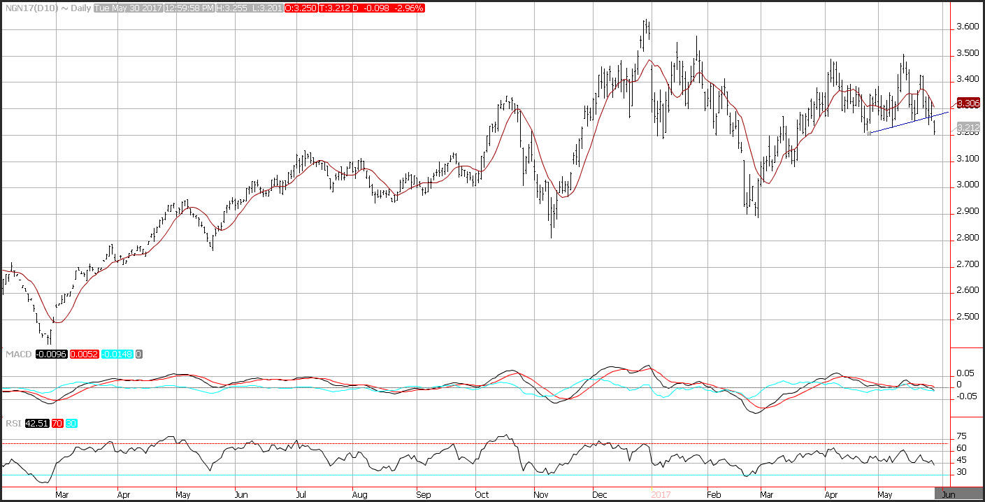 Natural gas prices moved lower on Monday, as cooler than normal weather spread across most of the east coast of the United States, reducing cooling demand, which reduces natural gas demand. Prices sliced through and upward sloping trend line near 3.26 which is now seen as short term resistance, and quickly tested the April lows near 3.20. Additional resistance is seen near the 10-day moving average at 3.30. Prices have formed a double top, as part of a head and shoulder reversal pattern.