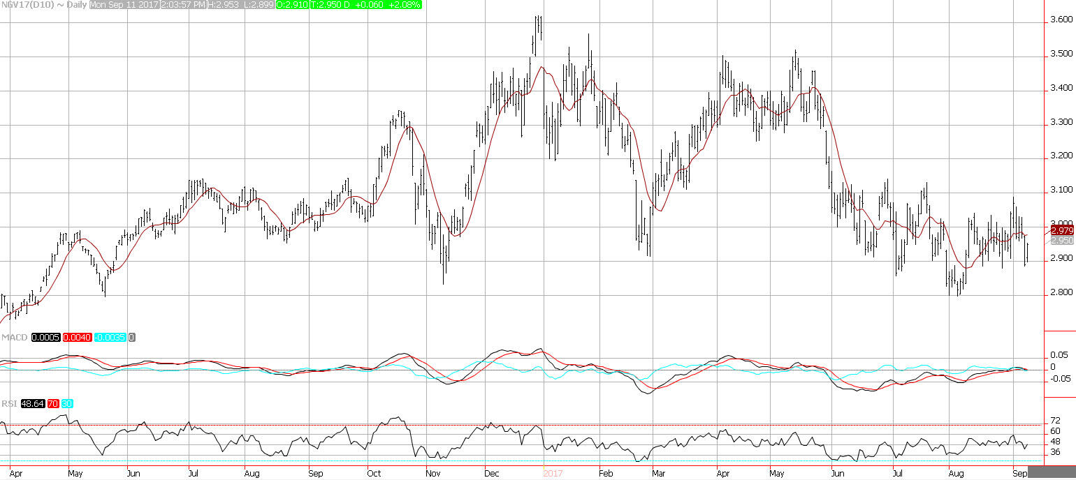 Natural gas prices whipsawed moving higher after tumbling on Friday. Natural gas demand is expected to decline as more than 6-million people are without power in Florida. If there is no electricity use, the demand tumbles and turbines that make electricity with natural gas will not need to be used. Prices rebounded after testing support near the monthly lows at 2.88. Resistance is seen near the 10-day moving average at 2.98.