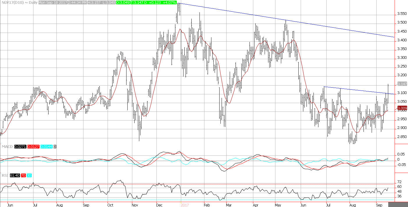 Natural gas prices broke out on Monday as Hurricane Maria was upgraded to a category-3 storm as it heads over the Caribbean. Production was already hampered following Hurricane Irma, and production has still not reached prior levels. Maria could move on sure in North Caroline which could reduce shipments up the coast to the North East.