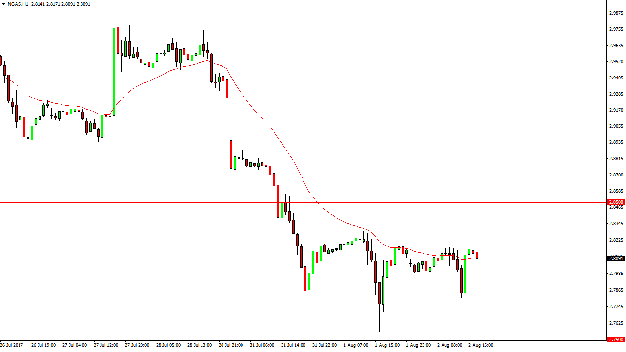 The natural gas markets were sideways during most of the day on Wednesday, but dipped enough to test the $2.77 level. As we rallied, the sellers came back in and started pushing the market a little bit lower. I believe that the $2.85 level above should be resistive, and I believe that given enough time sellers will return every time we try to get into the market to the upside. I believe that there is a gap above that could be targeted, so given enough time I think that if we do reach that area, it should be massively resistive. The $2.75 level underneath should be massively supportive, and if we can break down below there, that should be a market that is ready to go much lower, perhaps reaching towards the $2.50 level underneath.
