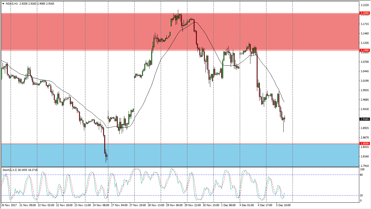 Looking at the natural gas markets, we have seen a roll over during the trading session on Tuesday, reaching down towards the $2.85 level below, which is a massive support region. This is an area that continues to attract a lot of attention, and the fact that we have rolled over so drastically during the last 4 or 5 sessions tells me that we are probably due for a bounce. On the hourly chart, we are starting to see a cross over in the oversold part of the Stochastic Oscillator, so we should eventually continue to go back towards the upside, perhaps to the $3.10 level.