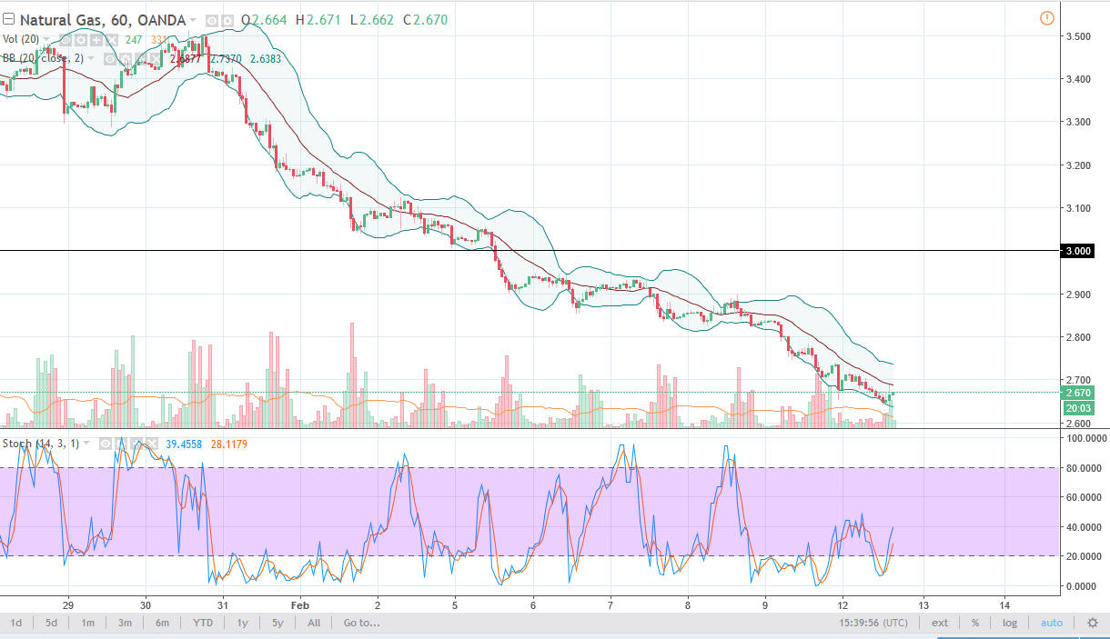 I believe that the $2.80 level above should be resistive, and I think that this area has already shown itself to be supportive, which of course makes sense as market memory comes into play. The $3 level beyond that is resistive as well, so I’m waiting to see some type of rally towards one of those areas that show signs of failing before I start shorting again. It’s obvious that market participants are bearish, and we have exited the time of year where there is bullish pressure for the commodity itself. The United States is starting to warm up a bit, and most certainly will be warm and the next couple of months, driving down the demand for natural gas overall. I think at this point, any rally will end up being a relief rally at best, giving us opportunities to go short repeatedly. Buying is all but impossible.