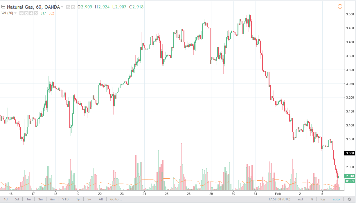 Natural gas markets went sideways initially on Monday, but as the Americans came on board, they started to push the market lower. We finally broke down below the $3.00 level, which of course has a certain amount of psychological importance attached to it. I believe at this point any rally is a selling opportunity, and that the “ceiling” in the market, Lee short-term, has moved down to the $3.10 level. Signs of exhaustion after short-term rallies should be a nice selling opportunity, and I think that the sellers will continue to punish this market as we are exiting the coldest part of the year in the futures markets for the United States.