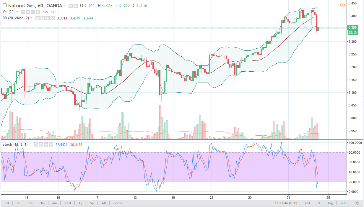Natural gas markets have gone sideways during most of the session on Wednesday, but then rolled over rather significantly to reach towards the $3.35 level. Longer-term, it’s likely that we will continue to see a lot of noise, and we are bit overextended, so I think this move is very necessary.