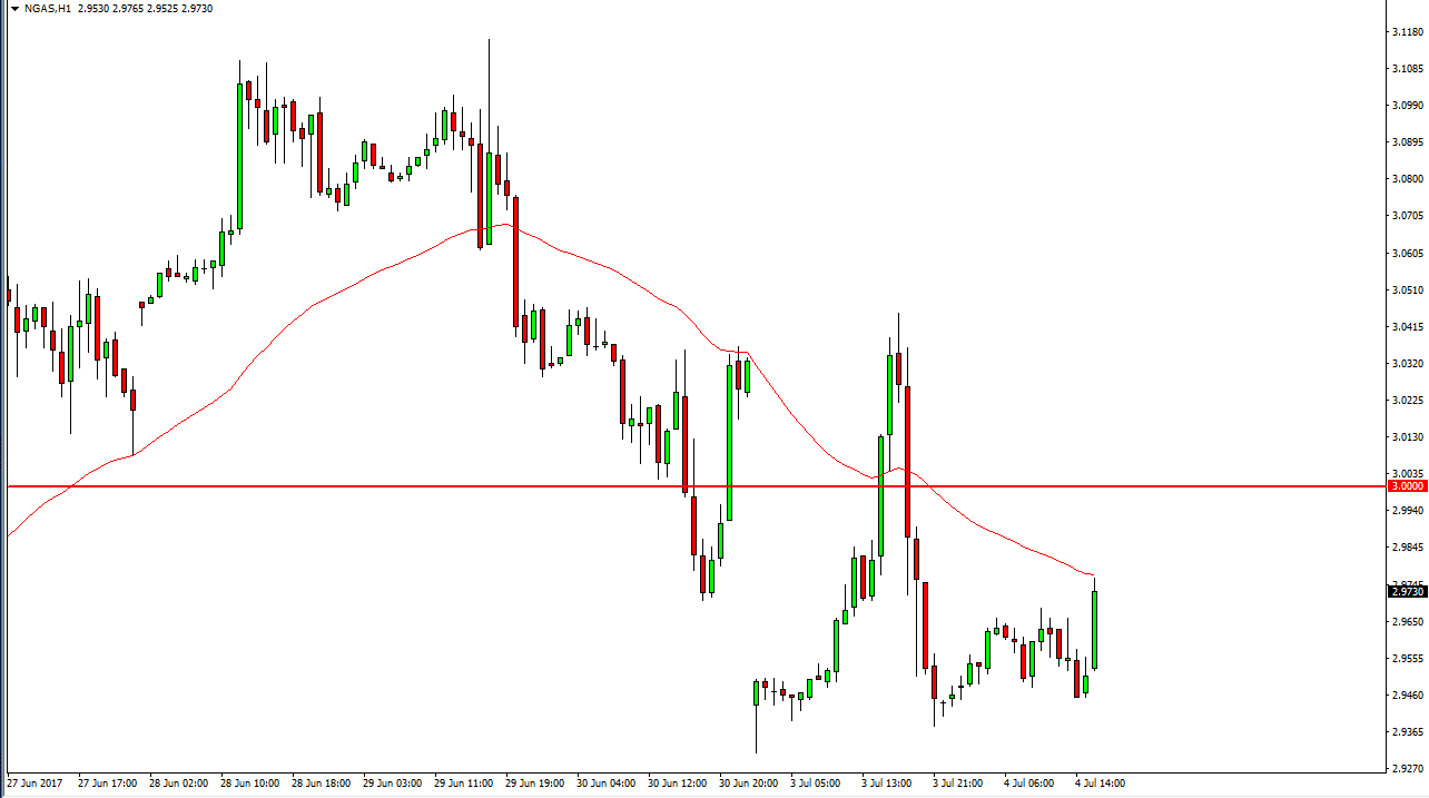 The natural gas markets were volatile during the session on Tuesday, but this would be expected as Americans were away celebrating Independence Day. Because of this, the markets would have been very thin, and that of course works against the value of moves. I think that not too much could be read into what happened, but it I still believe that the longer-term attitude on this market will continue to go lower. I think that rallies are selling opportunities, especially near the $3 level which should be psychologically resistive. You can see that the short-term rally that we have seen during the thin day was thwarted by the 24-hour exponential moving average, and that the $2.93 level underneath continues to offer support. If we can break down below there, the market should continue to go even lower, perhaps reaching down to the $2.90 level, and then eventually the $2.85 level.
